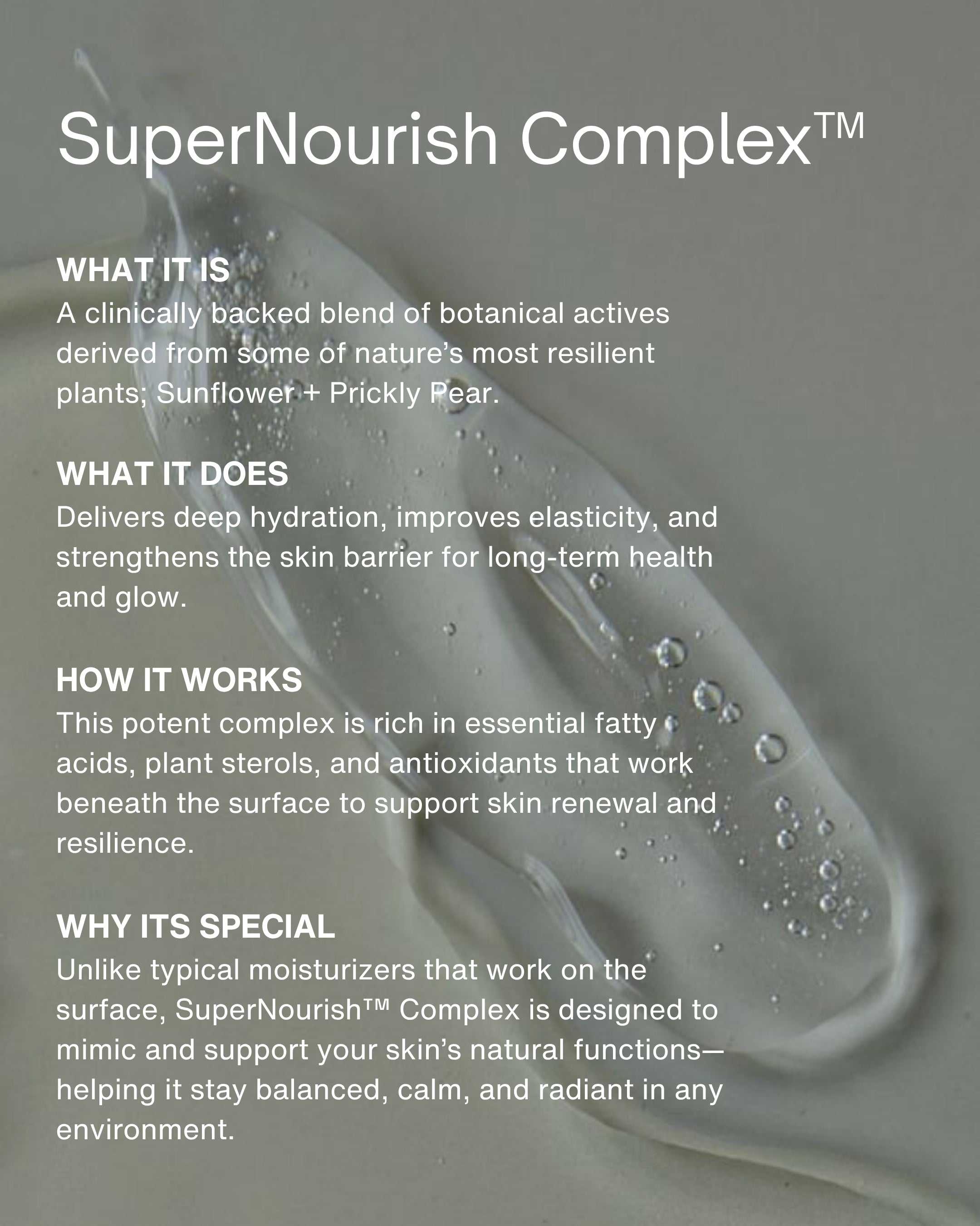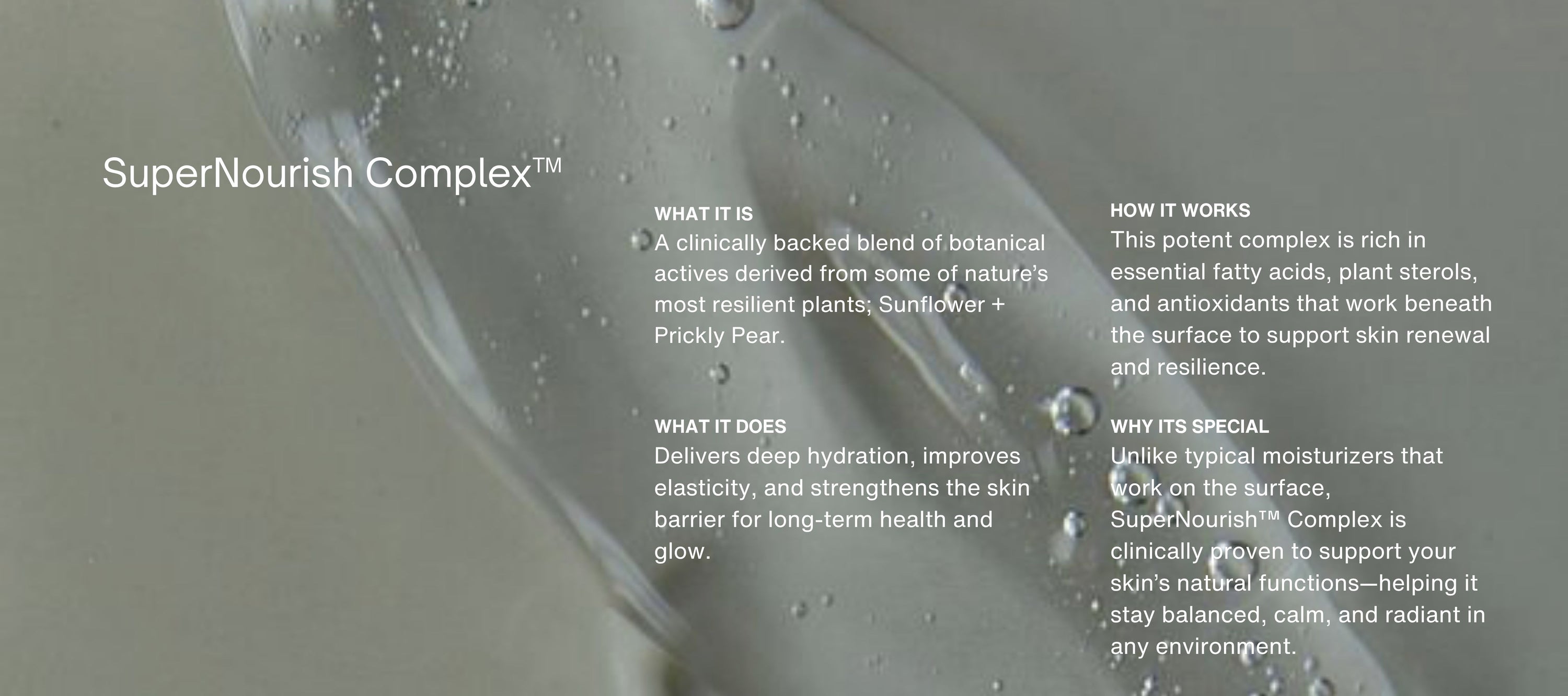 With consistent use, SuperNourish Complex™ gets to work beneath the surface, helping strengthen your skin’s natural moisture barrier. Your skin retains hydration longer, feels noticeably softer, and appears more even in tone and texture. The result? That deep, healthy glow that doesn’t fade by midday. Skin begins to feel less reactive to weather and dryness.